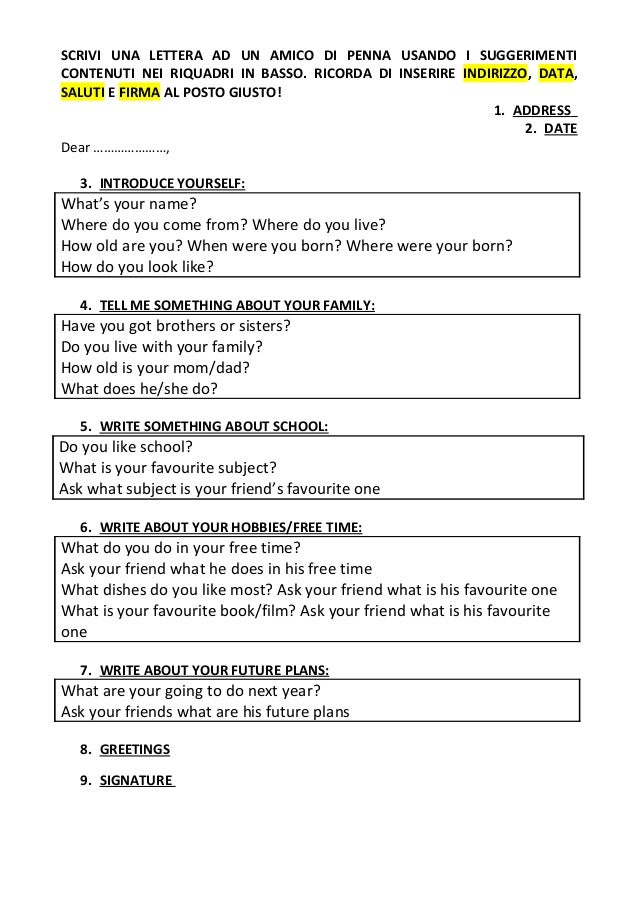 Pen friend: come scrivere una lettera a un amico di penna? - MyES Molto bene, a questo punto rispolveriamo la struttura base di una lettera (o email): Per prima cosa, si parte con i greetings, ovvero i saluti. A tuo avviso, dovranno essere formali o informali? Trattandosi di un amico, ovviamente parliamo di informal greetings, come ad esempio Dear, Hi o Hello.