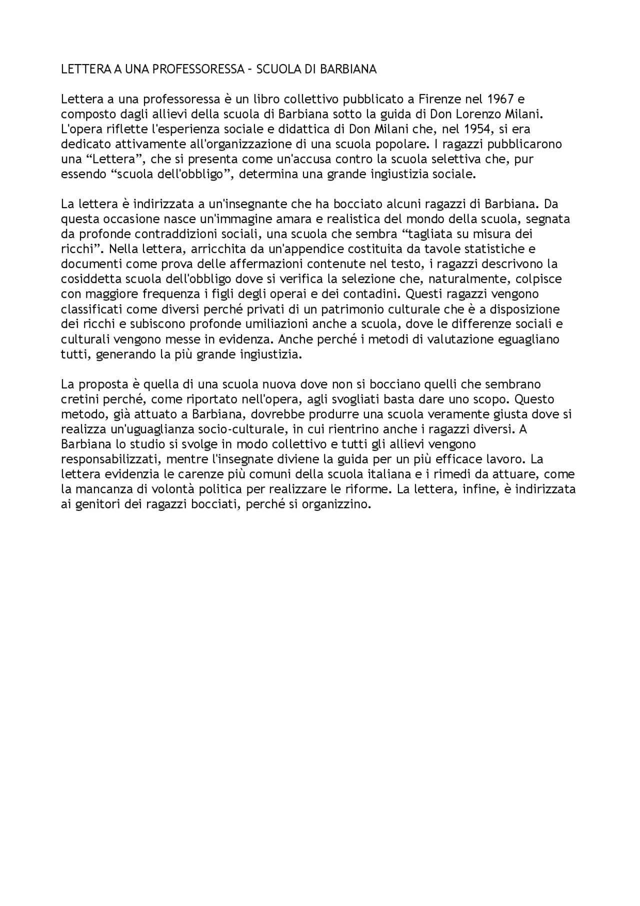 Lettera a una professoressa riassunto - StuDocu "Lettera a una professoressa" è un libro pubblicato a Firenze nel maggio 1967 e scritto da 8 allievi della Scuola di Barbiana sotto la supervisione di Don Lorenzo Milani, appunto in forma epistolare, dando del lei o del voi a chi legge. Lettera a una professoressa. Il potere sovversivo delle parole Scrive l'autrice: « Lettera a una professoressa nasce così, da un metodo che si è fatto concreta azione, scrittura, pratica politica: l'arte dello scrivere è la religione. Il desiderio d ...