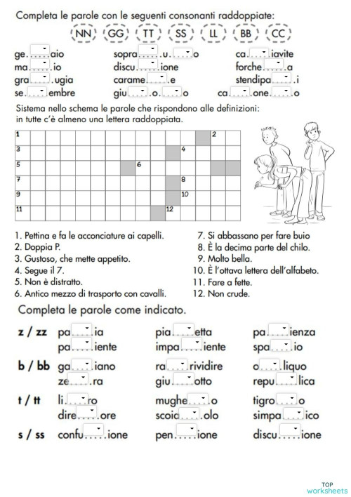 Regole del raddoppiamento - Impariamo Insieme Completa le seguenti parole con le consonanti doppie: tt, dd, ll, rr, ss, pp e zz. pia…a colte….o pa….ia a…izione carte…..o ra….a co….etto fre….o bo….one merle…o ca….etto pa….one ca….o ta….eto e….ore ca….aforte la….ina fo…ato ca….ello fa…oletto a…endo Esercizio n° 4 Completa facendo attenzione al raddoppiamendo di consonante.
