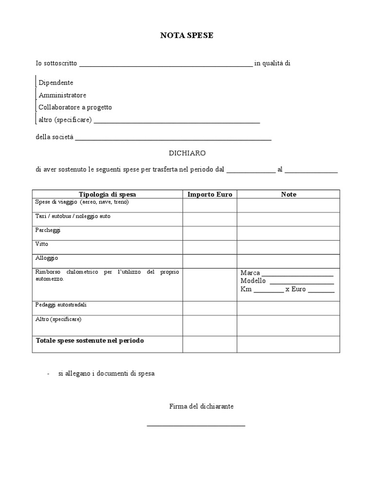 Nota spese |Fac simile da scaricare gratuitamente - IONOS Un rimborso spese può essere di tre tipi e, in particolare, quando si opta per il rimborso spese a piè di pagina è necessario compilare una nota spese. Per ottenere quindi i soldi indietro dal datore di lavoro è opportuno fare attenzione a riportare correttamente tutti i costi relativi al viaggio intrapreso. Indice A che cosa serve una nota spese?