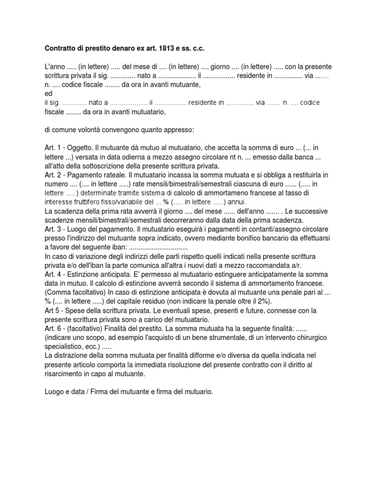 Scrittura Privata Per Prestito - Fac Simile E Guida Quando si scrive una scrittura privata per prestito, bisogna inserire nell'intestazione la dicitura "x Art. 1813 e ss. c.c., in modo da indicare che la tipologia del contratto di prestito è il mutuo, unica forma utilizzabile tra privati. Poi, è necessario specificare i dati personali delle parti coinvolte e l'importo che viene prestato.
