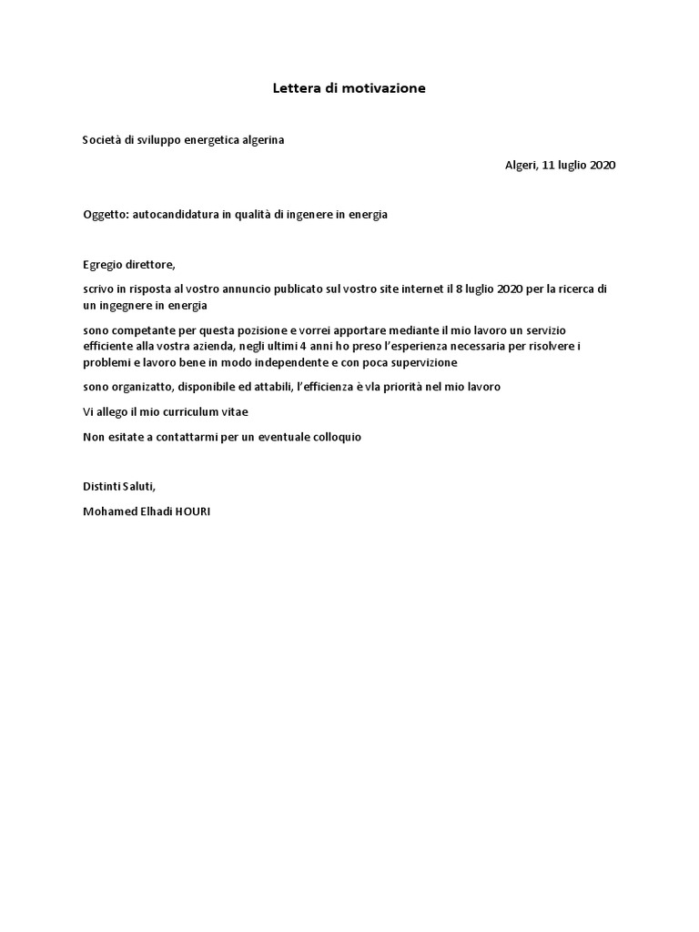 Lettera di risposta ad un annuncio di lavoro. Lettera di presentazione in risposta ad un annuncio: esempio reale Ti proponiamo un esempio reale di una valida lettera di accompagnamento scritta in risposta ad annuncio di lavoro. Sara Michelini Piazza Mazzini, 3. Francesco Guccini - Lettera - YouTube Francesco Guccini - Lettera - YouTube Video unavailable 0:00 / 18:49 Video unavailable The uploader has not made this video available in your country Francesco Guccini - Lettera... Ita, il Mef sottoscrive la lettera d’intenti di Lufthansa 7 hours ago · 1' di lettura. Il Mef ha sottoscritto questo pomeriggio la lettera d’intenti di Deutsche Lufthansa AG per acquisire una quota di minoranza di Ita Airways. È quanto si legge in una nota del ... Come scrivere una lettera di raccomandazione (+ Templates ... Nov 3, 2017 · 1. inizia con all'interno indirizzo e formula di apertura. Usare carta intestata dell'azienda per rendere la vostra lettera di raccomandazione formale. Mettere la data quando hai scritto la lettera sulla prima riga e poi scrivere nome, posizione e indirizzo commerciale inferiore a quello del destinatario.